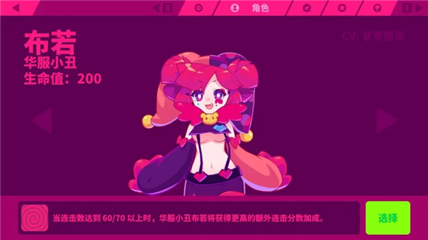 凛(兔女郎)和布若(华服小丑)两个角色是比较常用的加分型角色,其中小丑的技能是在combo达到50+的基础上进行的得分加成:60~69 (60%);70+ (70%),其他角色还是50%。