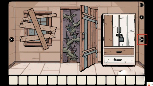 第二步,点击右侧箭头两下进入第二个房间。点击房门进入房间。