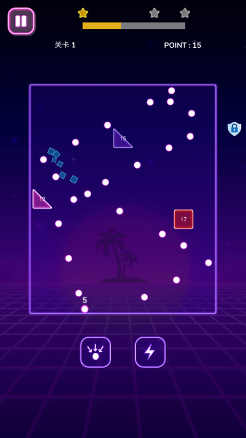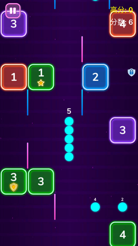 用地下的小球对着墙或者方块击打,方块被击的次数与所写次数相同时,方块会消失,当所有方块消失即为过关;