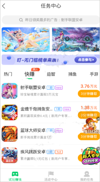 每日不断上新海量试玩任务,用户告别抢单的烦恼,赚到根本停不下