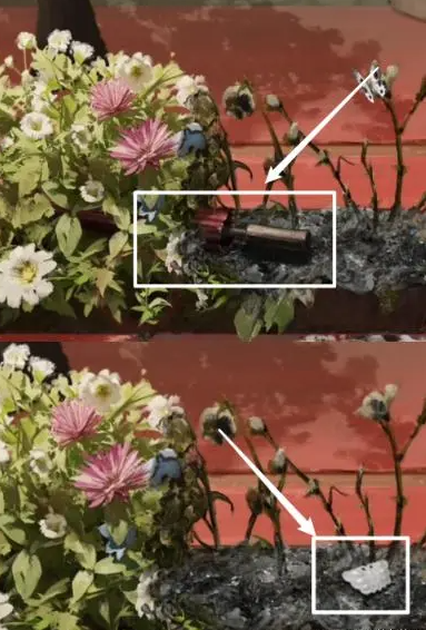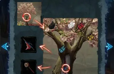 26、回到戏台上,根据木偶戏台的线索如图调整树上蝴蝶的位置与高度,拾取拨浪鼓和靠旗。