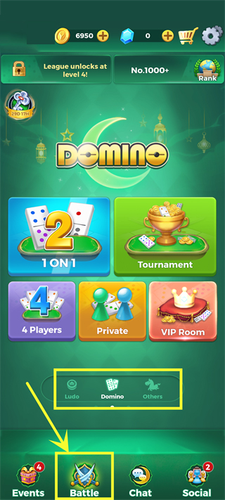 1、首先在本站下载并安装Yalla Ludo官方版后,使用加速器打开该游戏。进入游戏后默认为Battle即对决页面,在此玩家可以选择Ludo,Domino,Other三种玩法,