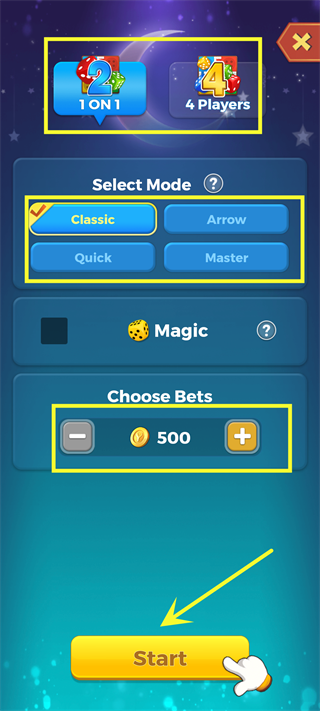 2、在Ludo玩法里,你可以选择双人或四人玩法,还可以创建房间与自己的好朋友一起对战,