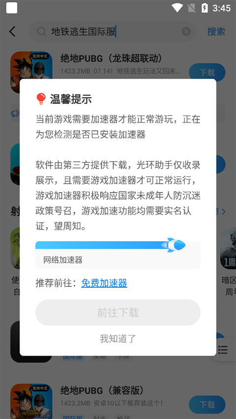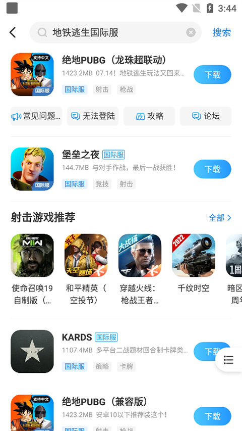 玩家在首页通过搜索框搜索下地铁逃生或pubg就会有其国际服游戏供用户下载