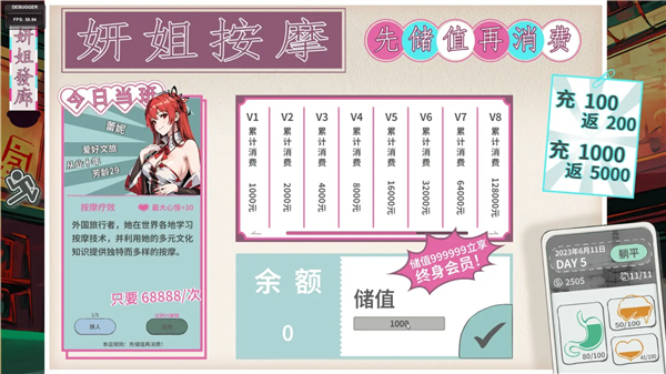 玩家不能直接用现金按摩,而是需要“充钱”,充100得200,充1000得5000,这是想调侃生活中开VIP卡的设定,你还可以累计消费总额,来提升你的会员等级。这种设定,是不是似曾相识?不过,这只是个单机游戏,不需要你真的付费充钱,只是一种调侃。
