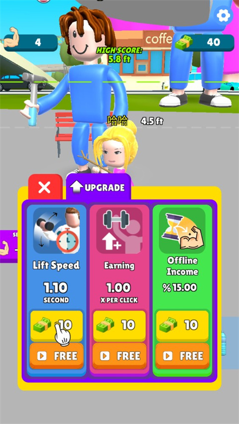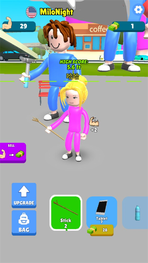 2、我们可以通过不断点击人物来加强自己的臂力,使他变得更加强壮,