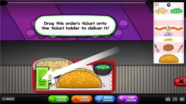 在本作中,每个顾客订单都是一个动手的过程,玩家必须轻松制作各种不同口味的塔可订单,首先玩家需要加入肉锅放到火炉进行烹饪,并继续检查每个锅翻转的正确的时间,当肉丁烹饪完成后倒入卷饼中,然后根据订单口味的需求加入各种配菜,最后在来一碗脆片和新鲜沙拉就能够出餐啦。