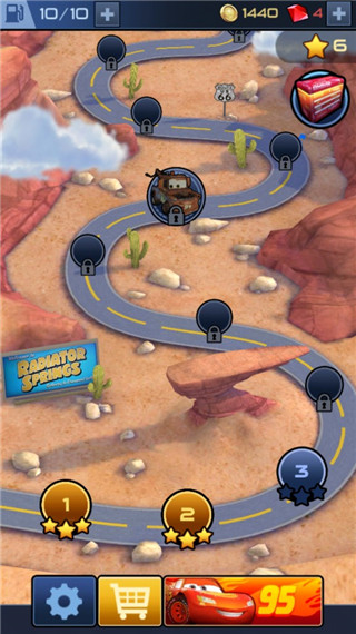 1、精美的3d画面,重现了《赛车总动员》电影中的角色,建筑和地标,加入了可爱有趣的动画效果!