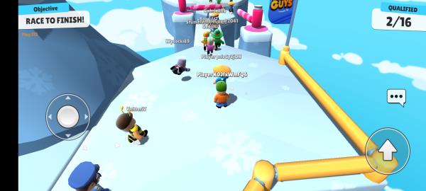 6、玩家需要通过虚拟按键控制人物移动,右边按键单击是“跳跃”,双击是“向前扑”,通过三轮障碍赛道(地图),每轮比赛结束后,抵达终点线或越过障碍的玩家将会进入下一轮,直到决出最后的冠军,