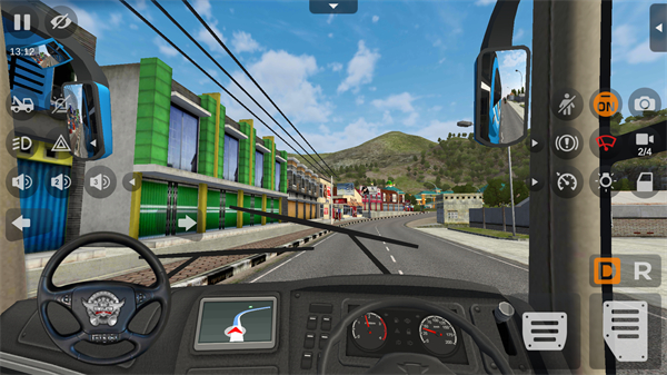 1、打开Bus Simulator Indonesia游戏,进入到驾驶视角,包括车灯、转向灯、喇叭、雨刷等功能按钮,选择D档后我们就可以通过右下角的刹车和油门按钮控制车辆移动了,