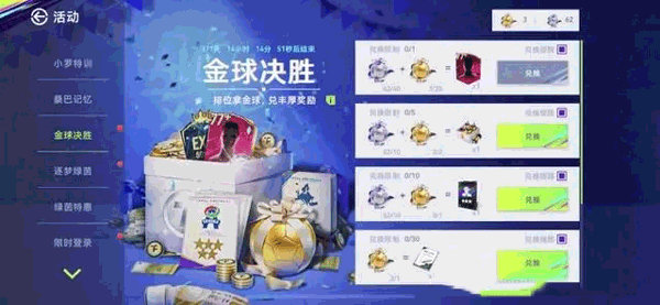 银球可以通过生涯赛获得,银球不限制获取数量,金球可以通过天梯比赛获得,金球每日上限15个。活动中40个银球+20个进球可以兑换77+的红卡球员