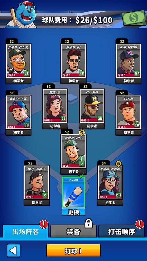6、每场比赛开赛前,你都可以在这里更换球员并装备球棒!