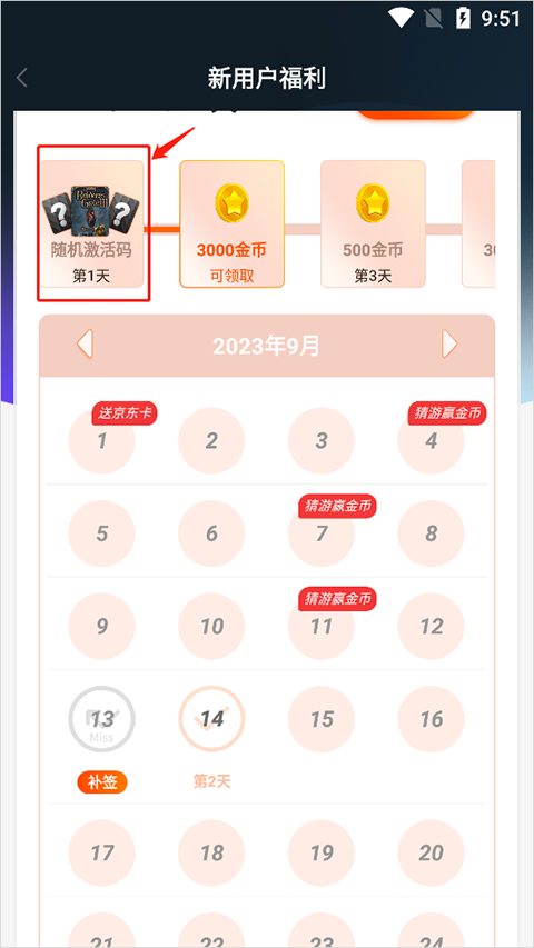 3、在这里可以看到到了第1天、第5天或者第12天等都是可以获得随机激活码。