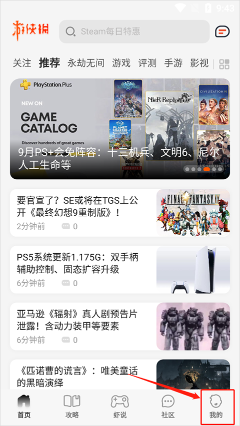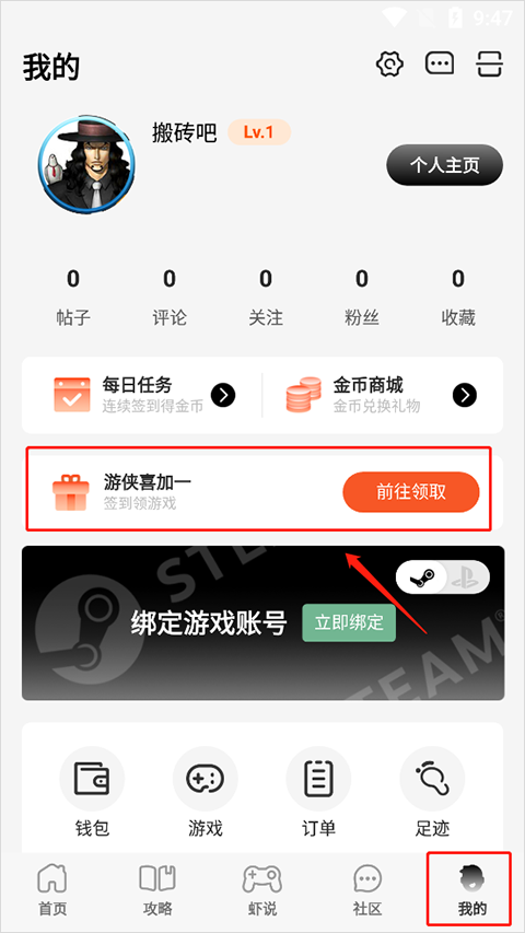 1、打开我的页面,在页面中,打开游侠喜加一活动选项。