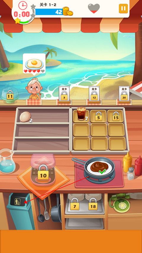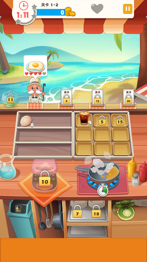 2、每一关都有目标,在规定的时间内完成任务。根据客人的需求制作食物,点击鸡蛋-烹饪即可煎蛋。