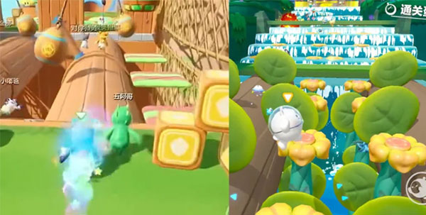 元梦【蹦蹦山谷】这张地图以山谷为背景,以弹跳为主要机关,另外加入了箱子、滚木、波形障碍等。而蛋仔的【山谷跃动】同样以绿意山谷和清泉瀑布为背景,同样是跳跃翻越地形,穿过滚木障碍。这两张图元素重合性略高,笔者觉得蛋仔的画面会更清新可爱一点。
