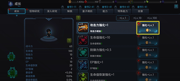 4、以放置型猎杀获得的材料进行成长和研究。
