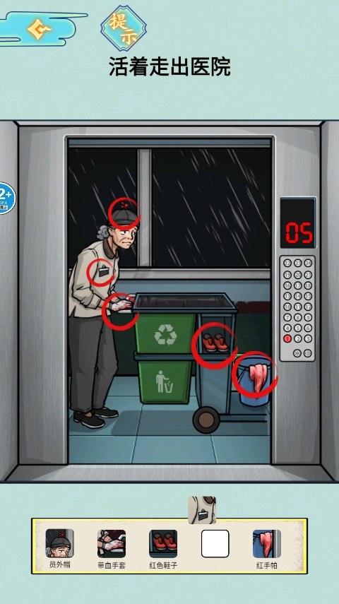 3、头上戴的帽子,带血手套,鞋子,红色手帕,胸口的牌子选择“让她进来最后选择“跟她走"
