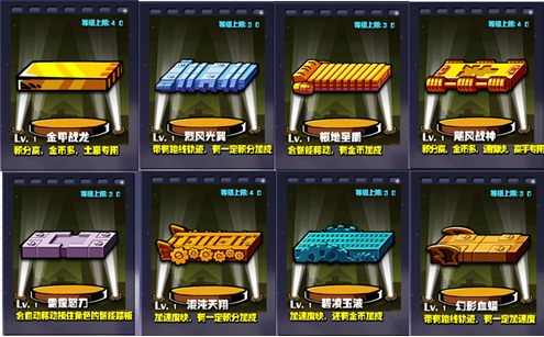 跳板选择随着金币及钻石的增加可以开启更多的跳板,跳板升级同样会有相应的属性增加,不同的跳板基础属性及样式也是不一样的(每快跳板的等级上限和外观造型是不一样的哟)