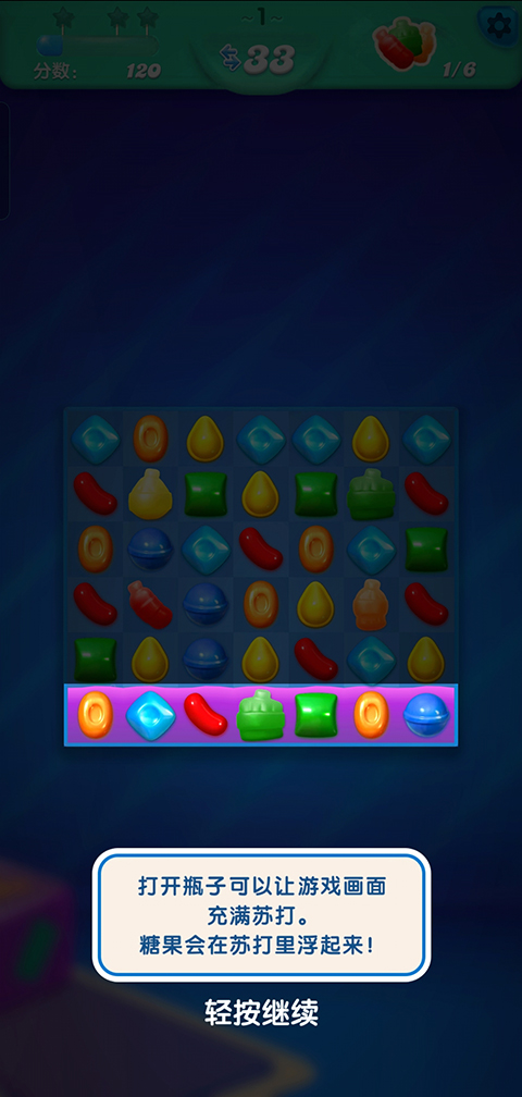 4、每打开一次瓶子,可以让游戏画面充满苏打,糖果会在苏打里面浮起来;