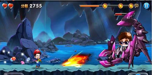 在BOSS关卡中,玩家需要在山洞中躲避障碍,等BOSS出现后收集途中的水滴不断攻击BOSS,减少其血量。小心别被BOSS追上,若Boss追上玩家则会攻击玩家,玩家扣血,并回到初始位置继续追击。