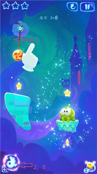 当糖果获得第一颗星星的时候将绳子割断,糖果便可顺着星河达到指定位置。