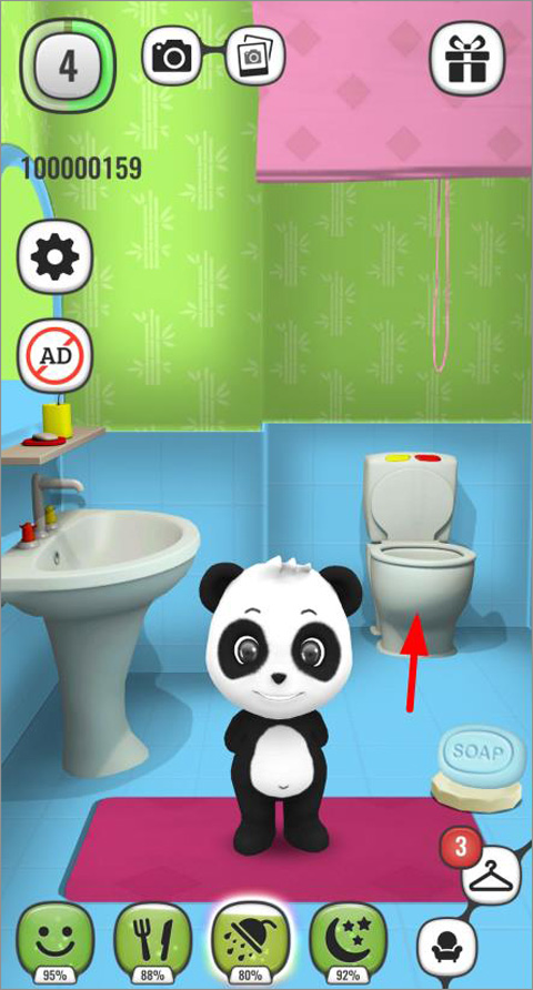 3、洗完澡之后点击后方的马桶小熊猫就会去上厕所;