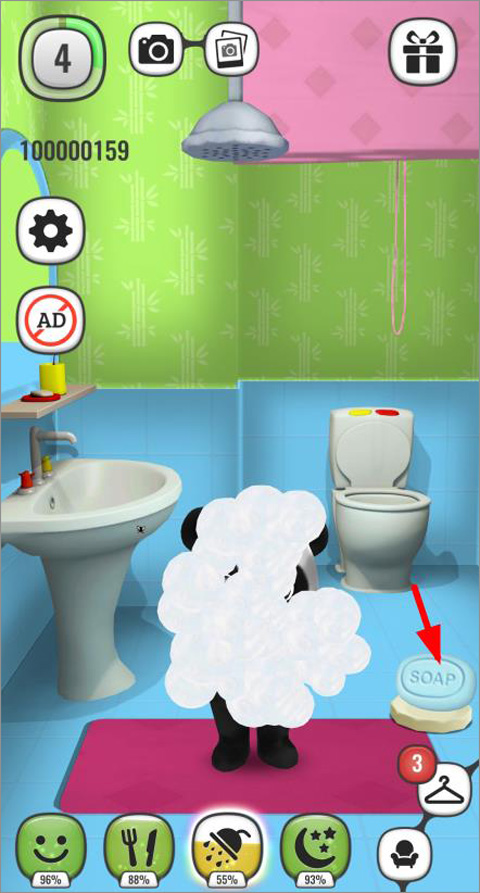 2、进入浴室后,点击右侧的香皂可以给小熊猫洗澡;