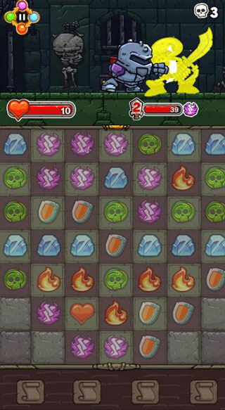 3、战胜敌人,游戏采用了消消乐的玩法,不同于消消乐的是可以拐弯连,只要是用一线连到底的就可以。