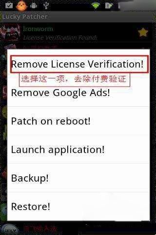 弹出的对话框如下图所示,选择第一项:Remove License Verification(去除收费验证),后面还有几个选项,包括去掉游戏中的广告,对游戏备份等等,在此不做详述,步骤都是一样的。