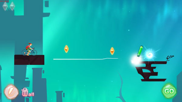 总体来说,游戏自由度颇高,为拓展玩家的思维,通过绘画出合适的路线,驱动单车收集沿途的梦想碎片,奔向远方的世界入口,游戏前期会显得比较的简单,但随着时间的推移和关卡的进行会慢慢变难。在游戏中抵达终点并不是唯一的目的,需要合理躲避以及利用关卡障碍,收集全部星星才能完美过关。