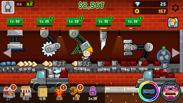 机器的解锁升级:解锁更高端的机器,合理的放置其位置,并对其进行强化升级,能够大大的增进碾压的威力,从而大大增加效益。