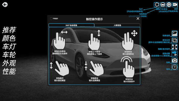 4、进入改装模式这辆保时捷就会打回原型,点击右下方的问号图标,会出现每个按钮的使用方法及作用,大家依据这个一目了然的说明去操作即可。值得一提的是左边一系列的选项,点击推荐可参考近期热门好看的车型,点击颜色可改变车身、车门以及前灯的颜色,还可以改装车轮、外观以及性能等。