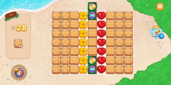 在消除界面左侧为显示为这一关的剩余步数及通关目标。以图中为例,关卡目前剩余步数为28步,需要消除46个箱子才能通关。