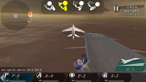 与一般的空战射击游戏玩法相类似,选择出战的战机,凭借你犀利的操控,根据左上角的雷达抵达相应的阵地,用导弹武器击敌对的战机。