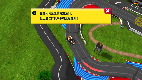 倒计时结束后,点击屏幕右下角的按钮就可以让车子加速前进了,仪表盘、时速值等数值全都木有,但游戏对玩家在过弯时的表现却十分注重,为此在车手头上设置了一个速度计,一旦速度过快就会变成红色,意思是警告玩家将要超出允许的转弯速度,如果无视它继续加速的话,下场很明了了,直接飞出赛道呗。
