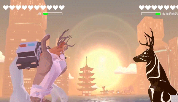 打完未来的自己跟鹿之诅咒后,两头鹿会上去地面,结合成1只超级黑鹿,我们鹿哥也不甘示弱,从现代喊上二哈跟其他动物军团组合成了一只非常普通的鹿进行对决;