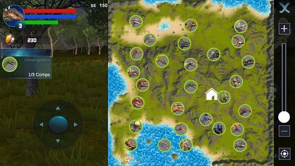 在右上角有地图导航功能,在中心上方有类似陀螺仪的罗盘导航,点击地图可以看到周围恐龙的分布情况,房子代表家,在家里可以繁育,培养剑龙下一代。