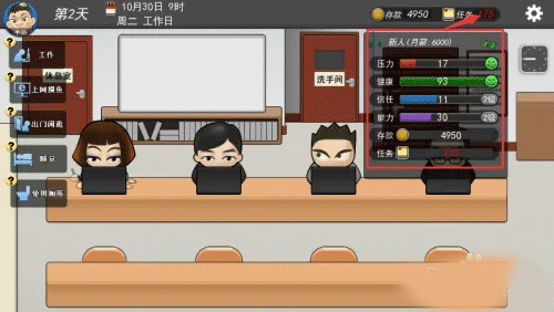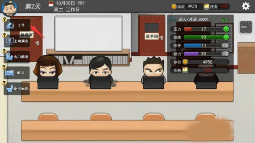 游戏高度还原了职场中大家常遇到的一些事情,并且游戏走向和结局有很多种,可以选择和不同人搞好关系,可以自己研究各种方法苟过去,比如疯狂上厕所等等。