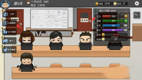 6、点击出门闲逛可以降低压力,但是被老板发现会减少信任度。