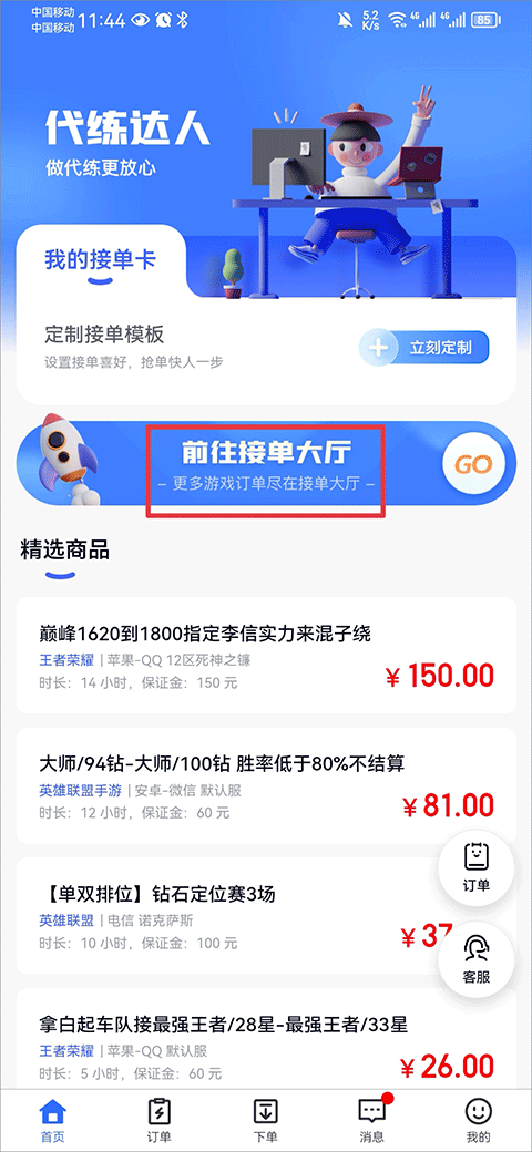1、打开代练达人app,完成账号登录和实名认证后,在首页中点击前往接单大厅