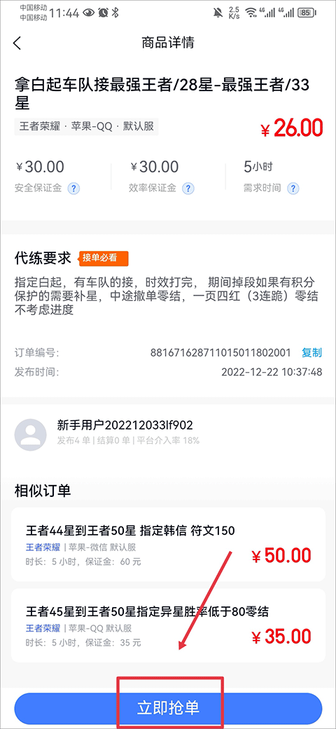 3、选中合适的订单后,在商品详情界面中点击立即抢单即可