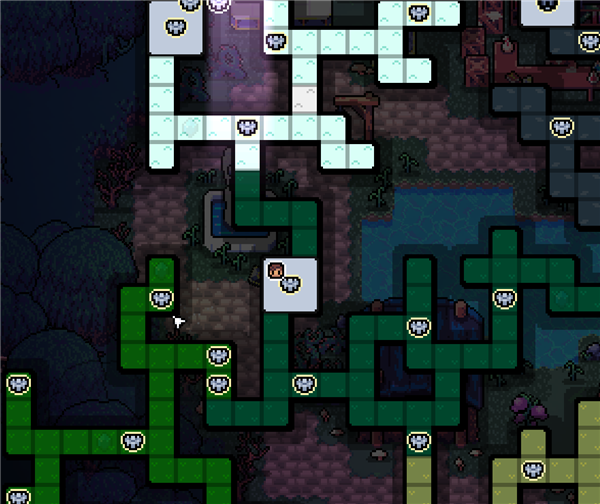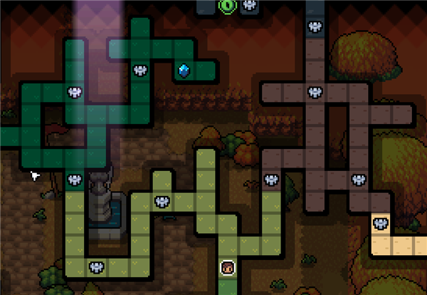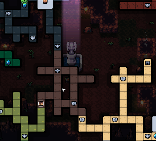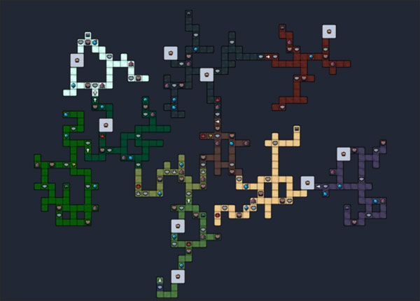 游戏每次开始都会重新生成一种整体构造的大地图,大多数格子会是野外,野外可以打怪,获得素材,积累金币,玩家可以自由的在这里穿梭,不同颜色代表了不同的生物群落,比如白色是雪山,绿色是丛林,黑色是洞穴。