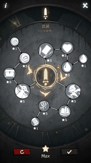 1、在主页面魔法书的右下角有一个怀表,点进去可以看到一个天赋页面,通过击杀不同类型的BOSS获得星星,点亮天赋能帮助玩家更顺利通关。(新版本赠送的南瓜灯可以获得双倍星星数)