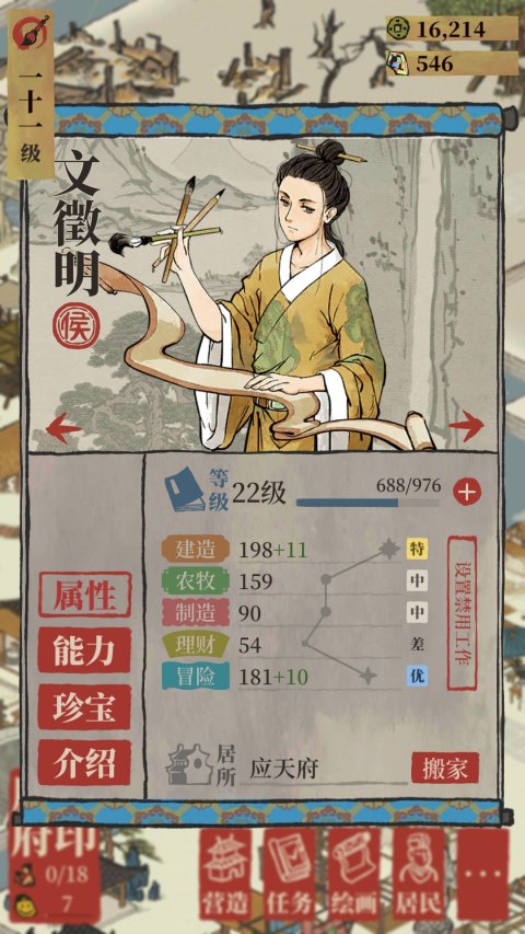二、是人物的理财属性培养。对于理财属性强的人物要重点培养。李时珍和白素贞的理财能力已经差不多培养到能增收30%的程度,用在产出最大的画院产出相当可观。