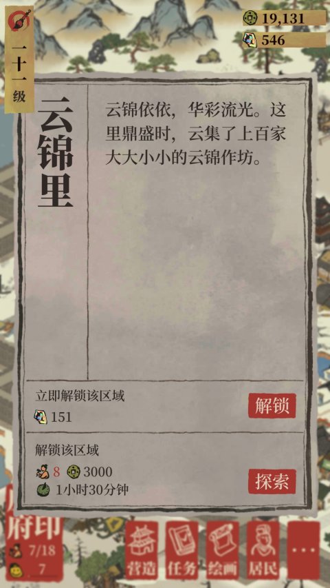 在“娱乐”和“装饰”项目中,所有的建筑和花木都能增加城市的繁荣度,每当繁荣度达到一定条件时,就会解锁一个民居,从而增加居民人口数量,为城镇提供更多的劳动力。