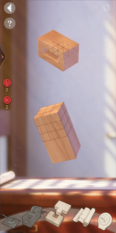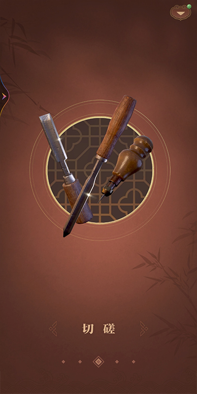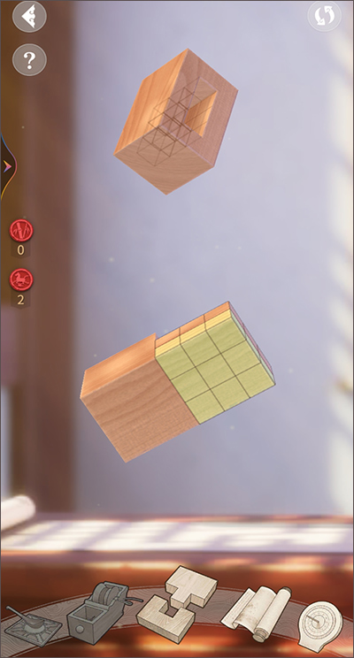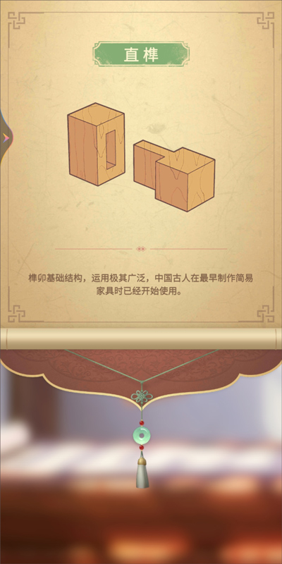 搭建榫卯结构的目标正是通过玩家精巧细腻的加工,使结构与结构之间严密扣合,达到“严丝合缝”的完美结合。以第一个关卡为例,画面中“榫”结构与“卯”结构分别将位于屏幕的上下两端,只需点击屏幕上方的物件,二者将会进行切换,在空白处滑动手指则能旋转位于屏幕中间的物件。