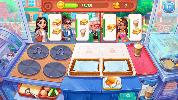 2、玩家只要根据客人的口味来做出她们喜欢吃的煎饼,不过需要注意的是旁边绿色的进度条,这表示客人的忍耐值,当忍耐值达到红色时,就表示客人已经很生气了。