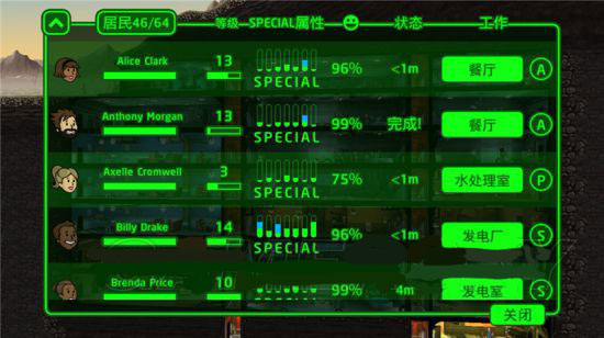 3、Endurance 耐力: E高的居民适合储存室或者探险(捡瓶盖),E属性同时决定血量[4] 。
