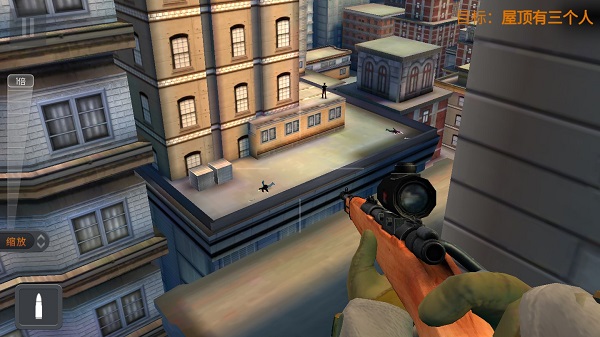 游戏中我们遵循了作为一个狙击手的原则,原地不动静待猎物出现,也就是不可移动,通过滑动屏幕来控制狙击枪的瞄准位置,拖动屏幕左边的缩放按钮来控制狙击镜的放大程度,拖到最高处狙击镜到达最大倍数。点击左下角的子弹位置来射击,当我们放大狙击镜射击的时候右上方会出现个装弹按钮,点击填充子弹,当前子弹数目在屏幕的左下角可以看到。